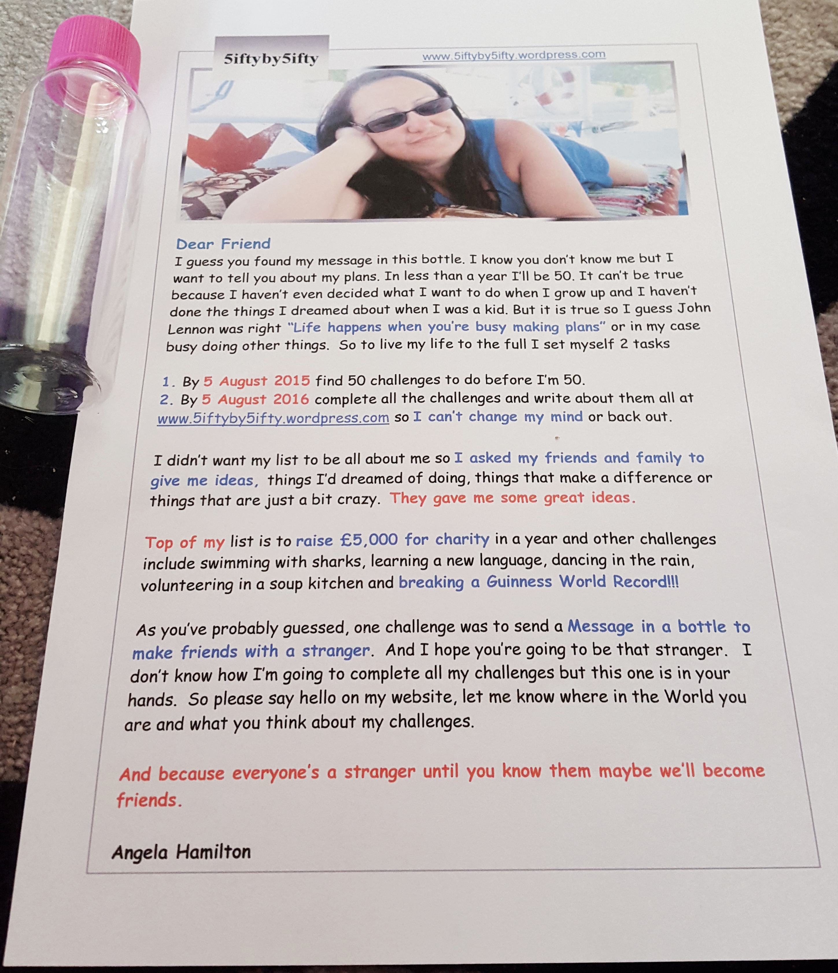 The Message: The internet couldn’t help me here. This one had to be all my own. If I want the person who finds it to become a friend then it needs to be interesting. I can’t just say hello, my names Angela, please let me know if you got this message. I need them to want to get in touch or I’ll never know what happened to my message. So after a few attempts I decided to tell whoever finds it about 5iftyby5ifty. Hopefully the idea of finding out if the middle-aged woman, who really should know better, actually managed to swim with sharks, walk on fire and raise £5,000 for charity. So with the letter finally written all I needed was a bottle.